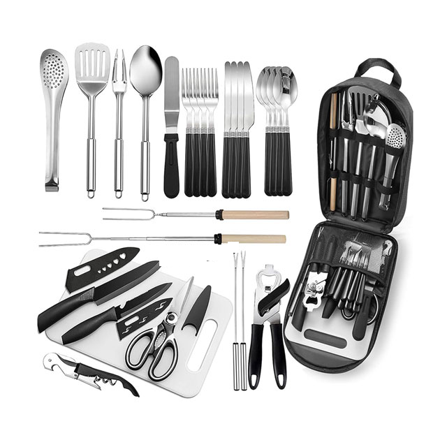 ست ۲۷ تکه ظروف کمپینگ چهار نفره مدل LENND شامل ترکیبی از ابزارهای ضروری برای آمادهسازی، پخت و سرو غذا در طبیعت است. از چاقوی سرآشپز و تخته برش گرفته تا ملاقه، کفگیر، دربازکن و چنگال باربیکیو – همه چیز در این ست لحاظ شده است تا هیچ نیازی در حین آشپزی باقی نماند.